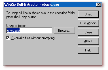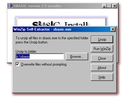 หน้าที่ของเราตอนนี้ก็คือ ใส่ที่อยู่ให้แก่โปรแกรม SBASIC (ในรูป กำหนดเอาไว้ที่ c:/sbasic) หลังจากนั้นก็กดที่ปุ่ม unzip แล้วโปรแกรม ก็จะถูกติดตั้งไว้ ณ ที่เรากำหนดเอาไว้