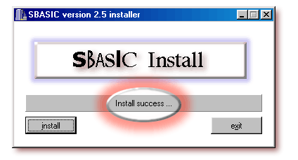 ให้ติดตั้งเหมือนการใช้ sbasic.exe แต่ให้กำหนดปลายทางของโปรแกรมอยู่ที่ c:/sbasic หลังจากนั้นก็ปิดโปรแกรม sbasic.exe แล้วโปรแกรม sbinstall.exe จะแสดงข้อความว่าจบโปรแกรมดังนี้