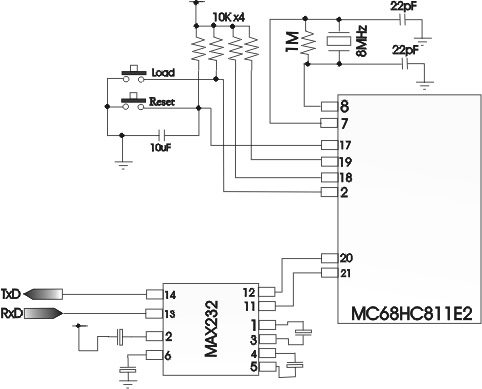 ก่อนอื่นขอข้ามมาพูดถึง บอร์ดทดลองกันก่อนนะครับ บอร์ดที่ผมเลือกใช้ประกอบการศึกษาการเขียนโปรแกรมกับ 68HC11 ก็คือบอร์ด บอร์ดไมโครคอนโทรลเลอร์รุ่น EXP4 LAB1 MCU หรือใครจะใช้บอร์ดรุ่น jr-6811 ก็ได้ครับ ... จริงๆ แล้วกะจะต่อวงจรเองด้วยล่ะครับ เพราะมันเสริมสร้างความเข้าใจเราได้ดีขึ้นเยอะเลย ประกอบกับชิพ 68HC811E2 เนี่ยมันเป็น Single Chip การต่อยิ่งง่ายกว่าปกติ ใครสนใจจะต่อเองก็ต่อได้ตามนี้ครับ (เป็นผังวงจรแบบง่ายๆ นะครับ ... เหมาะกับผมดี .. ฮา)
