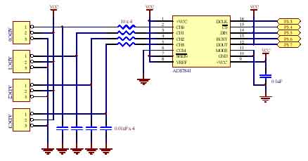 โดยวงจรการเชื่อมต่อของ ADS7841 กับไมโครคอนโทรลเลอร์ P89C51RD2 ในบอร์ดควบคุมรถหุ่นยนต์ ET-ROBOT-RD2 นั้น เป็นดังรูป