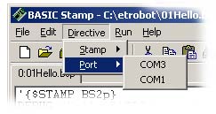 | คราวนี้กำหนดว่าบอร์ดของเรานั้นต่อสายกับพอร์ต COM ใด โดยกำหนดจากเมนู Directive / Port แล้วเลือก COM1 /COM2 /COM3 หรือ COM4 ตามที่เครื่องของเราติดตั้งเอาไว้ อย่างในรูปด้านขวาี้จะเป็น COM1 | ![]() |