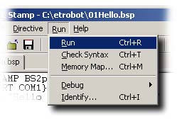 เอาล่ะ ตอนนี้เราสามารถสั่ง Run ได้แล้วครับ การ Run นั้นจะเป็นกระบวนการที่ BASIC Stamp Editor จะลบโปรแกรมในบอร์ดควบคุม แล้วทำการดาวน์โหลดโปรแกรมที่เราเขียนนี้ลงไปที่บอร์ด |