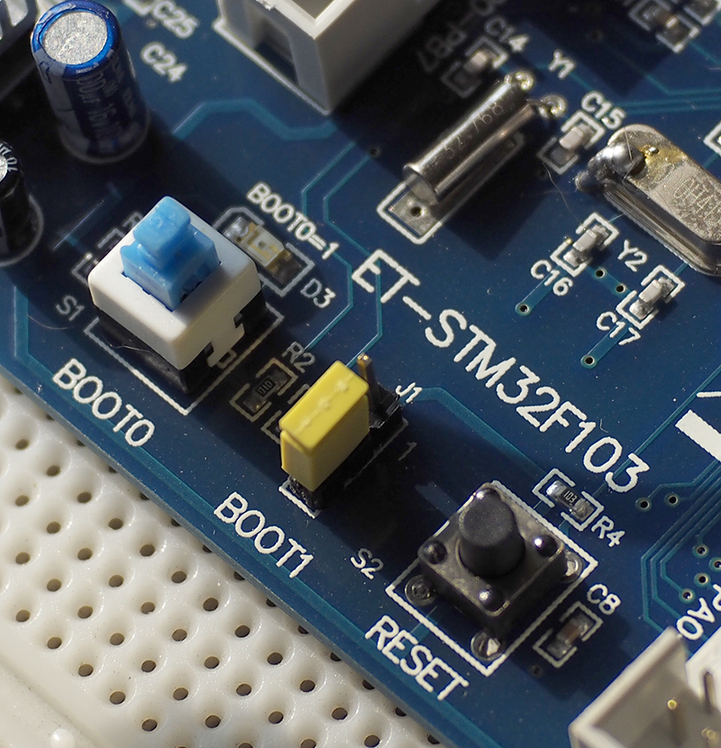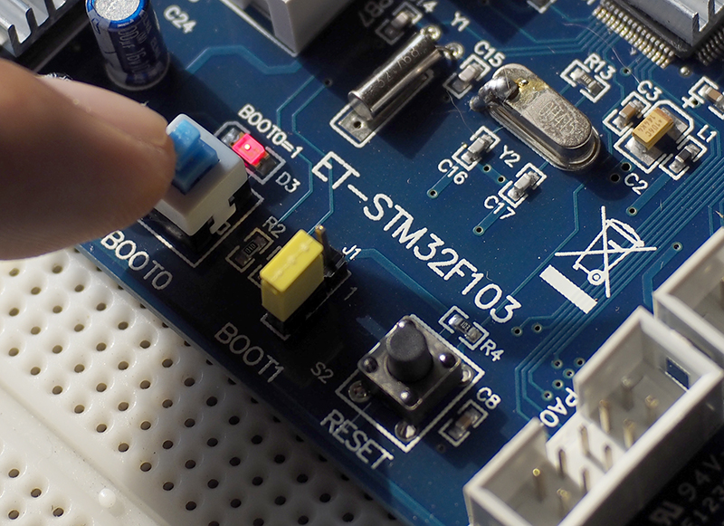 - ตอนนี้โปรแกรมของเราถูกอัพโหลดเข้าบอร์ดเรียบร้อยแล้ว คราวนี้ต้องมายกเลิกโหมดการโปรแกรมชิพกันครับ ด้วยการกดที่สวิตช์ BOOT0 อีกครั้งเพื่อให้แอลอีดีดับ แล้วกด RESE