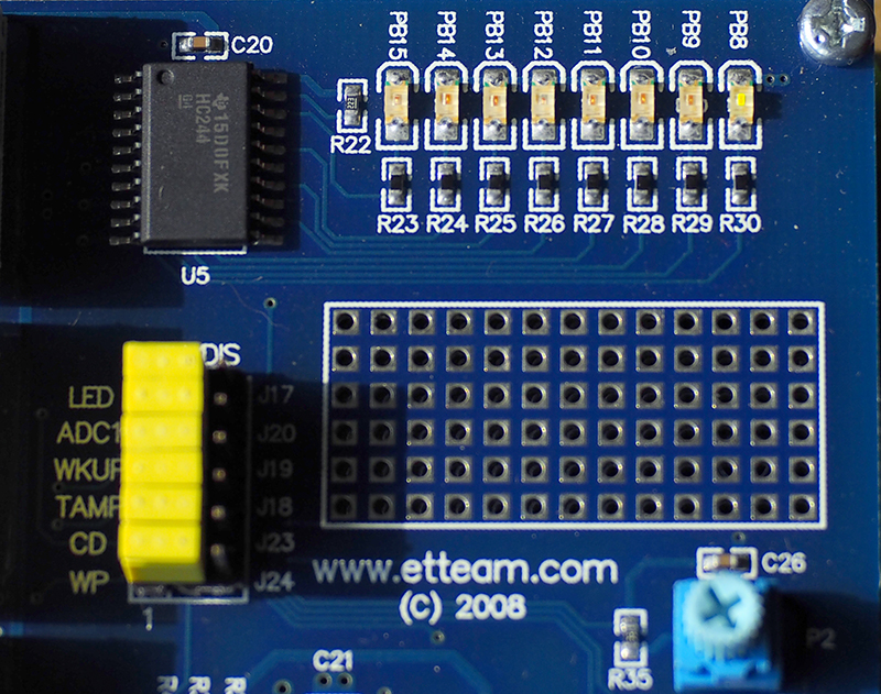 จะเห็นว่า ตัวอักษรกำกับเอาไว้คือ PB8, PB9, ..., PB14, PB15 นั่นหมายความว่าพอร์ต B ของ STM32F103 ของเราเชื่อมต่อกับอุปกรณ์แอลอีดีเหล่านี้ด้วยขาที่ 8 ถึง 15 ของพอร์ต B และที่สำคัญคือตรวจสอบด้วยนะครับว่าได้ Enable LED เอาไว้ (ดูจัมเปอร์สีเหลืองด้านซ้ายล่างของภาพน่อ) ... เอาล่ะเขียนโค้ดกันครับ