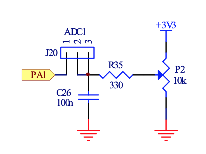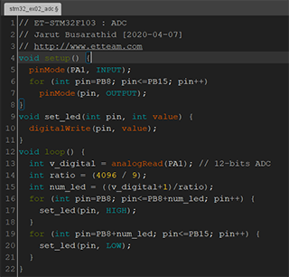 จากภาพจะเห็นว่าขาเชื่อมต่อกับวงจรคือขา PA1 ดังนั้น ในการเขียนโปรแกรมเราจึงต้องเลือกใช้คำสั่ง readAnalog() เนื่องจากข้อมูลที่ได้เป็นสัญญาณแบบแอนล็อก