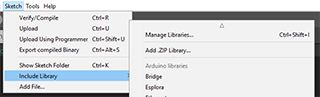 1. เริ่มจากเข้าไปที่เมนู Sketch เลือก Include Library แล้วเลือก Manage Libraries...