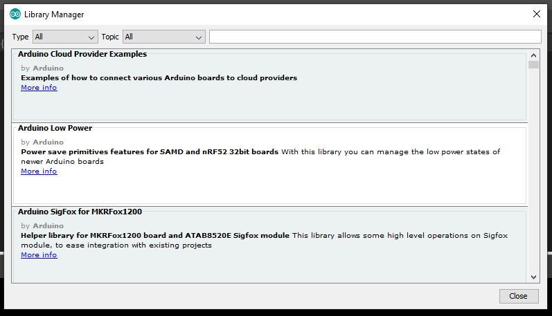 ไลบรารีที่เราจะใช้มีชื่อว่า LiquidCrystal_I2C มาเริ่มกันที่เข้าเมนู Sketch แล้วเลือก Include Library แล้วเลือกรายการย่อย Manage Libraries ... เพื่อเรียกหน้าต่างติดตั้งไลบรารีดังภาพด้านล่างนี้ครับ