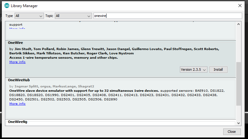 2. ที่หน้าต่างด้านล่างนี้ ให้พิมพ์หา onewire แล้วเลือกติดตั้งได้เลย