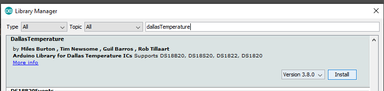 3. ติดตั้งกันต่อครับ คราวนี้หาคำว่า dallasTemperature แล้วติดตั้งได้เลย เทาสนี้ก็พร้อมใช้เจ้า DS18B20 กันแล้วล่ะครับ