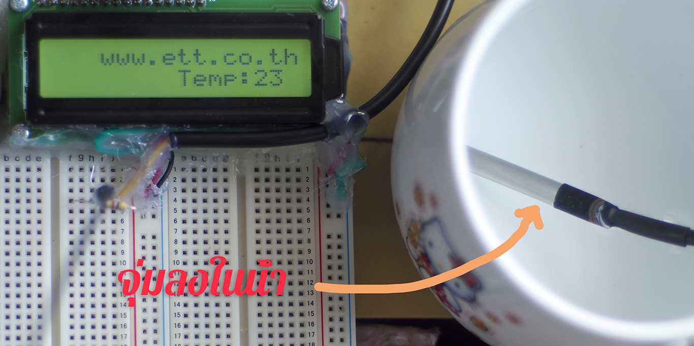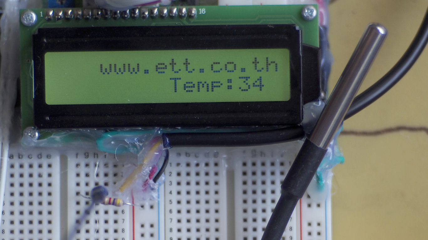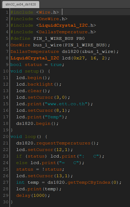 คราวนี้ก่อนใช้งานต้องสั่งเริ่มให้ทำงานกันก่อน คือ บรรทัดที่ 18 ได้เรียก ds1820.begin() เพื่อให้วัตถุนี้เริ่มต้นทำงานครับ