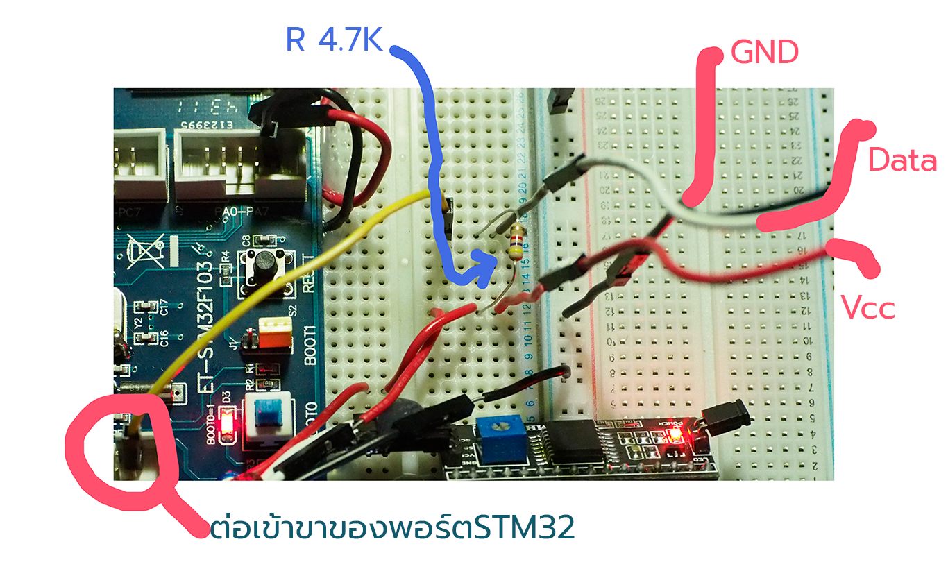 ที่ต้องระวังอย่างมากในการใช้งาน คือ ตัวเซ็นเซอร์ต้องการ R-Pull up ที่ขานำออก โดยต้องใช้ R ที่มี 4.7K ดังภาพนี้ครับ