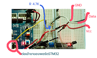 จากภาพด้านบน เราจะต้องต่อสายวงจรจาก PROBE DS18B20 HAT ซึ่งมีสายไฟ 3 เส้น คือ สีดำสำหรับต่อเข้าร่วมกับกราวด์ของ ET-STM32F103 สายสีแดงต่อเข้ากับไฟของของบอร์ด และอีก 1 เส้น (สายสีเหลือง) ต่อเข้ากับ R 4.7k โดยขาอีกข้างหนึ่งของ R ต่อเข้ากับไฟ และต่อสายจากตรงที่อยู่ระหว่างไฟจาก R และจาก R ไปเข้าเซ็นเซอร์นี้เข้ากับพอร์ PB0 ซึ่งลำดับขาของพอร์ต PB0 เป็นดังนี้ครับ