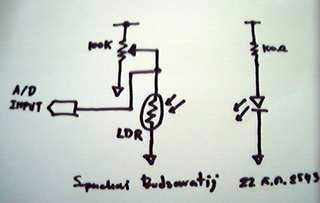 สวัสดีครับ .... ห่างหายกันไปนาน สำหรับบทความเกี่ยวกับ จิปาถะ (อื่นๆ) เมื่อวันที่ ๒๕ ม.ค. ๒๕๔๔ นั้น สถาบันราชภัฏ ในแถบตะวันตก ซึ่งประกอบด้วย เพชรบุรี (ผมทำงานอยู่ที่นี่) , จอมบึง (จ.ราชบุรี), นครปฐม และ กาญจนบุรี ได้จัดแข่งขันกีฬาสัมพันธ์ ระหว่างสถาบัน โดยมี สรภ. กาญจนบุรี เป็นเจ้าภาพ ... การแข่งขันครั้งนี้เป็นการแข่งขันกีฬา ครั้งแรก ที่มีการแข่งขันวิชาการพร้อมกัน ในส่วนของการแข่งขันวิชาการนั้น มีการแข่งขัน 3 ประเภท คือ ตอบคำถาม, เกมส์ และ ควบคุมหุ่นยนต์ ... ในส่วนของการแข่งขันควบคุม หุ่นยต์นั้นจะเป็นการนำเอาหุ่นยนต์ปล่อยเข้าไปในเขาวงกต ในทางเข้าของเขาวงกต ... โดยด้านบน และด้านล่างของกำแพง จะมีเส้นสีดำให้หุ่นใช้สำหรับ ตรวจสอบเส้นทาง ... หลังจากปล่อยหุ่นยนต์เข้าไปแล้ว ต้องให้หุ่นยนต์ หาเส้นทาง สำหรับออกจากเขาวงกตให้เร็วที่สุด ... ซึ่งทางออกนั้นมีด้วยกัน 2 รูปแบบ คือ ทางออกจริงๆ กับ ทางออกที่กำหนดว่าเป็น death zone ... นั่นเป็นเป็นเรื่องการแข่งขัน ... แต่เรา จะมาดูถึง sensor หรือ ตัวตรวจจับ แบบ tracker line หรือ เดินตามเส้น ...sensor แสง ที่ใช้สำหรับ ตรวจจับเส้นนั้น มีหลักการง่ายๆ คือ ส่งแสงไปที่พื้น แล้วตรวจผลการสะท้อน ของแสงจาก พื้นนั้น ... โดยถ้าพื้นเป็นสีทึบ จะมีผลแตกต่างกับพื้นที่เป็นสีสว่าง ... ตัวตรวจจับแสงที่มีให้เลือกนั้น ก็มีหลายชนิดด้วยกัน ... ที่เราจะมาสนใจในบทความนี้ ก็คือ LDR กับ LED (เป็นตัวส่องแสงสว่าง) ... วงจรเป็นดังนี้ครับ