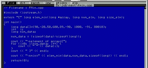extern "C" long elem_min(long *array, long num_elm, long size_elm);ซึ่งหมายความว่า เรากำลังบอกกับ Compiler ว่า เรามีฟังก์ชันชื่อว่า elem_min ที่ต้องการ argument จำนวน 3 ตัว คือ array ซึ่งเป็นตำแหน่งของข้อมูลแบบ อะเรย์ของ long, ต้องการ num_elm ซึ่ง ผมกำหนดว่า ค่านี้จะเป็นจำนวน สมาชิกในอะเรย์ (ค่าที่ส่งไปเป็นแบบ long) และ size_elm ศึ่งหมายความว่า เราต้องส่ง ขนาดของสมาชิกแต่ละตัวไปด้วย ... หลังจากนั้น มันก็จะคืนค่ากลับมาเป็นค่าแบบ long ... ส่วน extern "C" หมายความ จะทำการ link กันแบบ โครงสร้างของภาษา C (ขอไม่อธิบายล่ะกันครับ ค่อนข้างซับซ้อน ใครที่เรียน ภาษาแอสเซมบลีมาแล้วคงพอจะนึกภาพออกนะครับ)