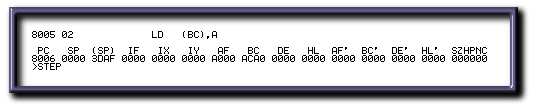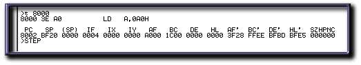 จากการ trace ครั้งแรก ทำให้รู้ว่า คำสั่งที่ ได้ทำไปนั้น คือ LD A,0A0H ผลจากการทำงาน ทำให้ A เก็บค่า A0 เอาไว้ (ดูจาก AF เป็น A000 นั่นหมายความว่า A เป็น A0h และ F เป็น 00h) มาดูคำสั่งถัดไปดีกว่าครับ ... ให้กด enter ต่อไปแล้วจะมีการแสดงผลออกมาดังนี้