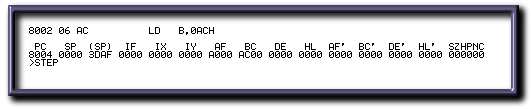 คราวนี้เราได้ทำการประมวลผลคำสั่ง LD B,0ACh ทำให้ผลลัพธ์ของรีจิสเตอร์ B เป็น AC