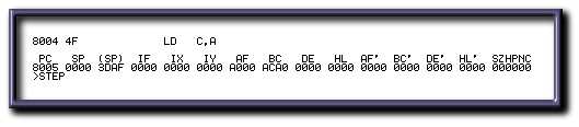 ส่วนถ้าเราจะ run คำสั่งต่อไปก็ให้สั่งว่า T 8006 เพื่อทำการ trace คำสั่ง ณ หน่วยความจำตำแหน่ง 8006 ต่อไป ...แล้วกด enter ไปเรื่อยๆ พร้อมทั้งคอยสังเกตว่า คำสั่งนั้นๆ มีผลกับรีจิสเตอร์อย่างไร บ้าง ... นี่ล่ะครับ style ของการเขียนโปรแกรมด้วยภาษาแอสเซมบลี ... จากตัวอย่างนี้เมื่อทำงานไปเรื่อยๆ สุดท้ายก็จะหยุดทำงานด้วยคำสั่ง HALT ซึ่งทำให้ Z80 หยุดการทำงานทั้งหมด ...