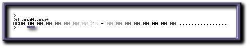 จากรูปด้านบนจะเห็นว่า คำสั่งที่กำลังทำงานนั้น คือ LD (BC),A ซึ่งมีความหมายว่า จะนำค่าที่เก็บใน A ซึ่งก็คือ A0h ไปเก็บเอาไว้ในหน่วยความจำ ณ ตำแหน่งที่กำหนด เอาไว้ในรีจิสเตอร์ BC ซึ่งก็คือ ACA0h ดังนั้น ผลการทำงานของคำสั่งนี้จะทำให้ หน่วยความจำ ณ ตำแหน่ง ACA0hเก็บค่า A0h เอาไว้ ... เพื่อให้เห็นผลของการทำงานจริง .. ให้เรากด ESC เพื่อออกจากการ trace แล้วกดคำสั่ง D ACA0,ACAF เพื่อสั่งให้ โปรแกรมมอนิเตอร์ แสดงข้อมุลของหน่วยความจำตำแหน่ง ACA0 ถึง ACAF ออกมาทางหน้าจอ ... ซึ่งผลจะออกมาเป็นดังนี้