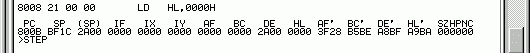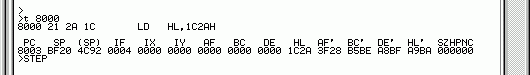 หลังจากที่เราโหลดเสร็จแล้ว คราวนี้ก็เริ่มทำการ trace ทีละ step กันเลย โดยสั่งว่า t 8000 แล้วผลลัพธ์จากออกมาดังรูป 6-2 คำสั่งแรกที่เราสั่งให้ z80 ทำก็คือ LD HL, 1C2Ah ซึ่งเป็นการนำค่า 1C2Ah ไปเก็บในรีจิสเตอร์ HL โดยในการเก็บนั้นจะแบ่งข้อมูลเป็น 2 ไบต์ ส่วนหนึ่งเก็บเอาไว้ที่ รีจิสเตอร์ H (จากรูปจะเห็นว่า H เก็บ 1C) อีกตัวหนึ่งเก็บเอาไว้ใน รีจิสเตอร์ L( เก็บ 2A)