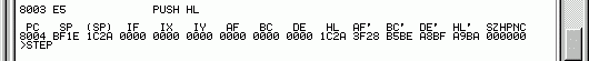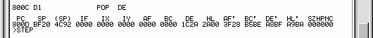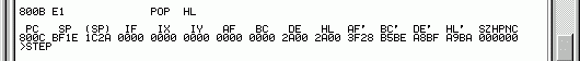 เมื่อเรากำหนดให้ HL เป็น 0 ไปแล้ว จากคำสั่งก่อนหน้านี้ คราวนี้ก็ลอง POP HL ซึ่งหมายความว่า เอาค่าจากส่วนบนสุดของ stack มาเก็บในรีจิสเตอร์ HL ในรูป 6-7 จะเห็นว่า SP ถูกเพิ่มค่าจากเดิม ในรูป 6-6 เป็น BF1C มาเป็น BF1E เหมือนในรูป 6-3 และค่าของ HL ก็เป็น 2A00 เหมือน DE ทั้งนี้เพราะ เราเอาค่าของ DE ใส่ลงไปใน stack จากคำสั่งก่อนหน้านี้ (เพราะอย่างนี้ stack จึงถูกเรียกว่า LIFO ไงครับ)