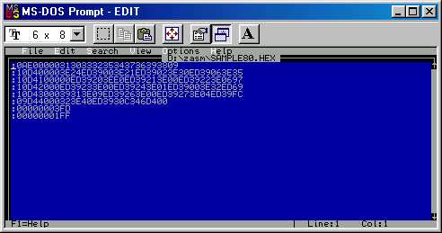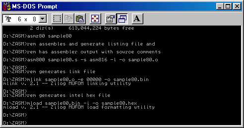 ?a equ 7 out0 macro ?p, ?r db 11101101B db 00000001B+(?&?r AND 7) SHL 3 db ?p endm ; ********************************************************************** ; Using the Z182 evaluation board ; This software does DMA by memory to asci ; DMA is the source - Output of ASCI is displayed onto the monitor ; ********************************************************************** org 0E000h dw 03031h dw 03233h dw 03435h dw 03637h dw 03839h ; ********************************************************************* ; INITIALIZE THE ASCI ; ********************************************************************* org 0d400h ld a,024h ; initializing the ASCI out0 (00h),a ; Tx enable, 8-bits, no parity, 1 stop bit ld a,021h ; not mp mode, ps=1 (/30 mode), x16 sampling rate out0 (02h),a ; parity doesn't matter, divide ratio - /2 ld a,30h out0 (06h),a ; ********************************************************************* ; DMA: MEMORY TO ASCI INITIALIZATION SEQUENCE ; ********************************************************************* ld a,000h out0 (20h),a ; load source addr of data memory ld a,0E0h ; source addr is 0E000h out0 (21h),a ld a,000h out0 (22h),a ld a,006h out0 (23h),a ; load destination addr of data memory ld a,000h ; destination addr is 06h - TDR0 out0 (24h),a ld a,01h ; TDRE (ASCI channel 0) out0 (25b),a ld a,00110010b ; I/O fixed, Memory +1, burst mode out0 (31h),a ; ld a,009h out0 (26h),a ; load the byte count register ld a,000h out0 (27h),a ld a,004h ; load the DCNTL w/the trnsfr mode out0 (32h),a ; memory - i/o, DREQ0=edge sense ld a,040h ;disable DMA termination interrupt out0 (30h),a ; load the dma status register loop: jp loopเสร็จแล้วก็ทำการคอมไพล์ด้วยการสั่งว่า asmz80 sample80 แล้วก็จะมีการแสดงผลดังรูปด้านล่างนี้ครับ