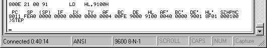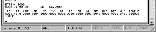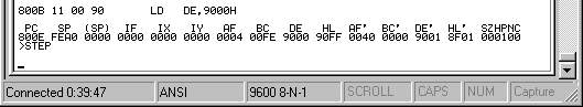 หลังจากนั้นเราก็เริ่มสั่ง t 8000 เพอื่เริ่ม debug คำสั่งแรกเป็นการกำหนดให้ DE เป็น 9000h อันนี้จะเห็นว่า เรากำหนดล่ะนะว่า ปลายทางอยู่ที่ 9000h