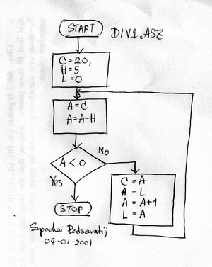 ; ; Filename : Div1.asz ; Author : Supachai Budsaratij (raek@se-ed.net) ; Date : 04/01/2001 ; Hardware : ET-Board V6 (Z80 Mode) ; ET-Board V5 ; ET-Board V4 ; ET-Board V3.5 NewPower ; CP-jr180 Plus ; Note : L = C / H , C=20, H=3, and return the result to L. ; ; INCL "etv6.inz" ; Include header for ET-V6 ; INCL "etv4.inz" ; Include header for ET-V4 ; INCL "etv35.inz" ; Include header for ET-V3.5 ; INCL "jr180.inz" ; Include header for CP-jr180 Plus ORG UMEM_ORG ; Start at UMEM_ORG main LD C,20 ; C = 20 LD H,3 ; H = 3 LD L,0 ; L = 0 div1: LD A,C ; A = C SUB H ; A = A-H ; If Sign-flag = 1 then jump to div1e JP M, div1e ; else LD C,A ; C = A LD A,L ; A = L ADD A,1 ; A = A+1 LD L,A ; L = A JP div1 ; Do agian. div1e: HALT ENDมาดู Flowchart ของโปรแกรมกันดีกว่าครับ