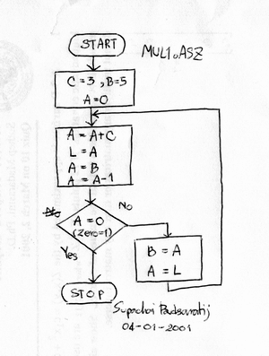 ; ; Filename : Mul1.asz ; Author : Supachai Budsaratij (raek@se-ed.net) ; Date : 04/01/2001 ; Hardware : ET-Board V6 (Z80 Mode) ; ET-Board V5 ; ET-Board V4 ; ET-Board V3.5 NewPower ; CP-jr180 Plus ; Note : L = C x B , C=3, B=5, and return the result to L. ; ; INCL "etv6.inz" ; Include header for ET-V6 ; INCL "etv4.inz" ; Include header for ET-V4 ; INCL "etv35.inz" ; Include header for ET-V3.5 ; INCL "jr180.inz" ; Include header for CP-jr180 Plus ORG UMEM_ORG ; Start at UMEM_ORG main LD C,3 ; C = 3 LD B,5 ; B = 5 LD A,0 ; A = 0 mul1: ADD A,C ; A = A+C LD L,A ; L = A LD A,B ; A = B SUB 1 ; A = A - 1 ; If Zero-flag = 1 then jump to mul1e JP Z, mul1e ; else LD B,A ; B = A LD A,L ; A = L JP mul1 ; Do agian. mul1e: HALT ENDอ่านยากไหมครับ ... อืม มาลองดู Flowchart ของมันกันดีกว่า ...