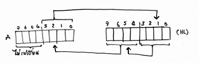 ตัวอย่าง เช่น A=12h ที่ (HL) เป็น 35h เมื่อเราสั่ง RLD จะได้ว่า A=13h และ (HL) เป็น 52h![]()