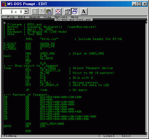 ตัวอย่างแรกเป็นการใช้ RRD ครับ .. ผมกำหนดให้ A เป็น 01h , HL ชี้ไปที่ DATA ซึ่ง DATA เก็บค่า 29h ดังนั้น ผลเลยได้ออกมาเป็น 9 ใช่ไหมครับ ... ผมก็ลองเปลี่ยนรูปแบบการแสดงผลดูบ้าง ... นี่เลย ใช้ 7Segment กันเลย ... แต่ 7 Segment มีข้อบังคับอยู่ว่า เราต้องส่งรหัสให้ถูกต้องด้วย จึงจะดูรู้เรื่อง ... ผมก็เลย รวบรวม pattern ของมันเอาไปไว้ใน N0 ถึง N9 โดย N0 เป็น pattern ของ ตัวเลข 0 ... ไปเรื่อยจน N9 ก็จะเก็บ pattern ของ เลข 9 ... มาดู code กันครับ