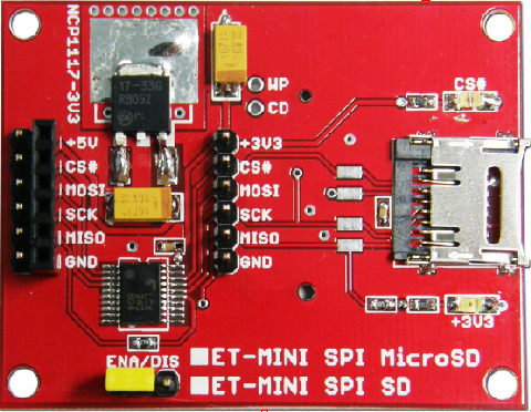 ET-MINI SPI MicroSD เป็นบอร์ด เชื่อมต่อระหว่าง MCU กับการ์ดหน่วยความจำ โดยรองรับการ์ดหน่วยความจำ ทั้งแบบ SD Card และ Micro-SD Card (บนบอร์ดติดตั้งเฉพาะตัวอ่าน Micro SD Card) โดยใช้การเชื่อมต่อ กับการ์ดหน่วยความจำในโหมด SPI ใช้สัญญาณในการติดต่อสื่อสาร 4 เส้นสัญญาณ โดยภายในบอร์ด ได้จัดให้มีวงจร แปลงระดับสัญญาณโลจิก (74LCX245) พร้อมวงจร Regulate 3.3V/1A ไว้ด้วย เพื่อให้สามารถเชื่อมต่อ การ์ดหน่วยความจำ กับ MCU ที่เป็นระบบ 5V ได้โดยตรง |