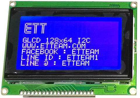 | GLCD 128 X 64 I2C เป็นจอแสดงผลในแบบ GRAPHIC พร้อม LED BACKLIGHT สีน้ำเงิน ขนาด 128 X 64 จุด | |||||||||||