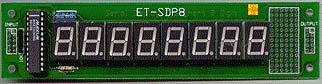 ET-SDP8 ... บอร์ดแสดงผลเป็น 7 SEGMENT LED 8 หลัก อเนกประสงค์ลดปัญหาในการทำงานของ CPU โดยใช้ IC MAX 7219 ซึ่งจะทำหน้าที่ SCAN DISPLAY เองโดย CPU ไม่จำเป็น ต้องเสียเวลามาจัดการ DISPLAY เอง ใช้สัญญาณควบคุมเพียง 3 เส้น ง่ายสะดวกและใช้พอร์ตน้อย