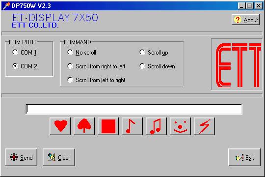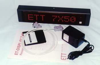 ชุด ET-DISPLAY 7x50 เป็นบอร์ดไฟวิ่งแสดงผลตัวอักษรเอนกประสงค์ ในราคาประหยัด ที่คุณสามารถนำไปติดแสดงข้อความ ในร้านค้าได้ ชุด DISPLAY ใช้ LED สีแดง แบบ DOT MATRIX แบบ 5 คูณ 7 DOT จำนวน 10 ตัว นำมาต่อกันได้ขนาด 7X50 สามารถแสดง ตัวอักษรภาษาอังกฤษได้เต็มหน้า 8 ตัวอักษร มีหน่วยความจำภายในแบบ EEPROM สามารถเขียนข้อความแล้วจดจำไว้ได้ถึงไฟจะดับก็ตาม ข้อความที่เขียนไว้ยังคงอยู่ โดยสามารถเขียนข้อความ ตัวอักษรเข้าตัว DISPLAY 7x50 ผ่านทาง PORT RS232 ของคอมพิวเตอร์ พีซี ทั่วไป พร้อมโปรแกรมเขียนข้อความในรูปแบบต่างๆ ทำงานบน WINDOWN 95 , 98