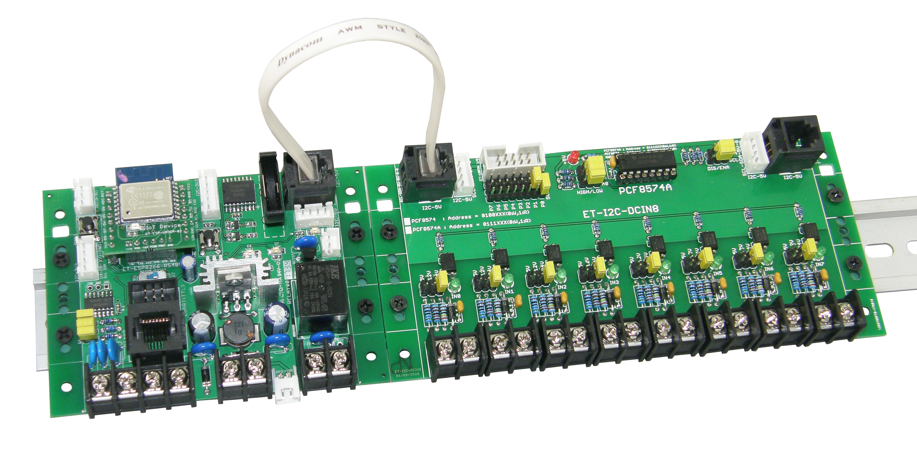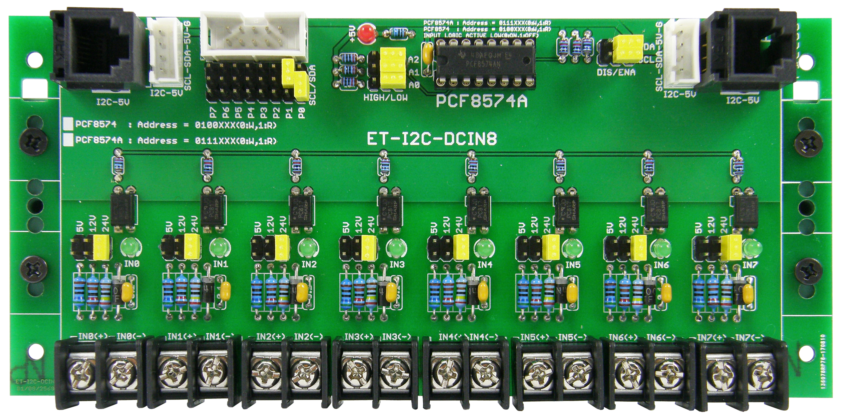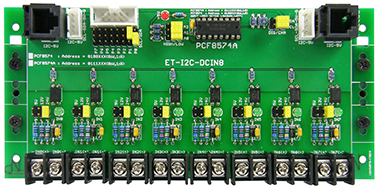 | ET-I2C DCIN8 เป็นบอร์ด INPUT DC ขนาด 8 ช่อง ต่อผ่านทาง BUS I2C โดยเลือกใช้ ไอซี PCF8574A เป็นไอซี | ||||||||